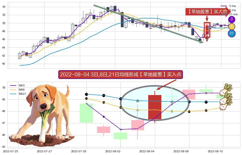 ⚀ 2022-08-04日显现 3日-8日-21日均线 【旱地拔葱】买入点 看多信号,后市看涨,买入