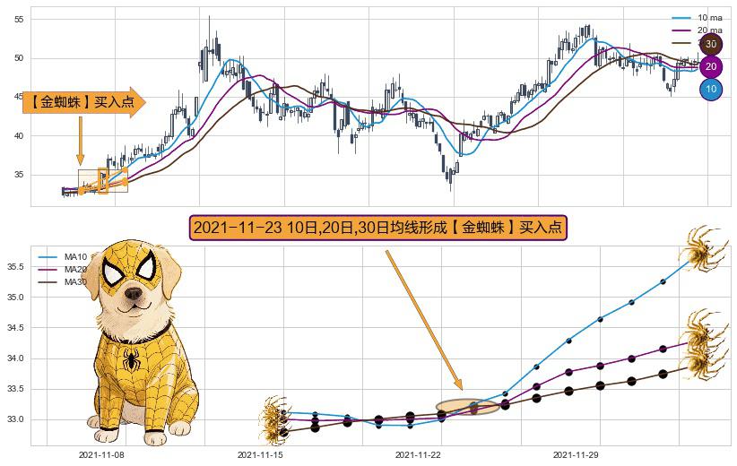 ⚀ 2021-11-23日显现 10日-20日-30日均线 【金蜘蛛】买入点 看多信号,后市看涨,买入