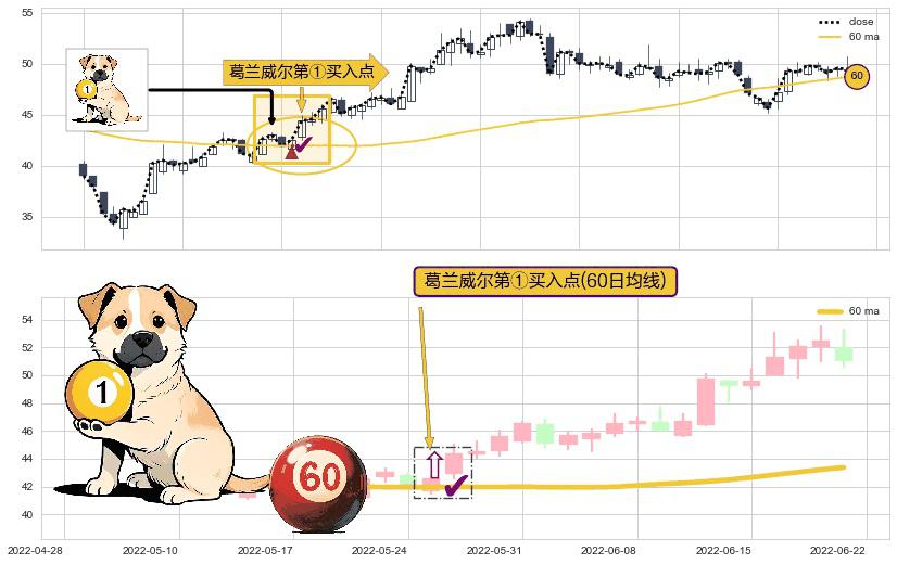 ⚀ 2022-05-25-日显现 葛兰威尔均线 60日均线 第买①入点 走势反转见底信号,后市看涨,买进信号