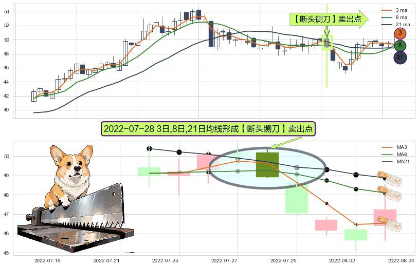 ⚀ 2022-07-28日显现 3日-8日-21日均线 【断头铡刀】卖出点 看空信号,后市看跌,卖出