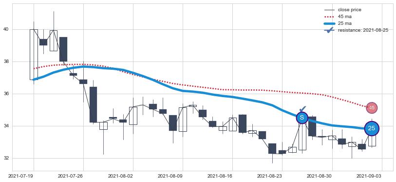 ⚃ 2022-07-28日开盘价格在三条均线上收大阴线,收盘全跌破均线,收盘股价下跌-2.10%
