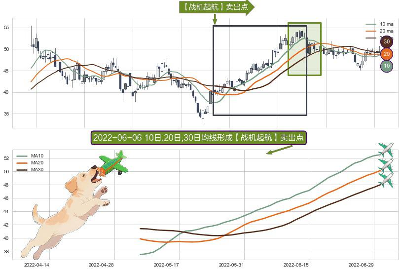 ⚀ 2022-05-09日-2022-06-30日显现 10日-20日-30日均线 【战机起航】卖出点 看空信号,后市看跌,卖出