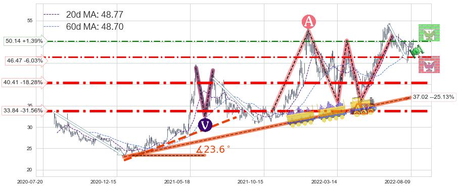 ♘ 支撑价格位46.47,可信任强度63.97%,距离最后交易2022-08-12形成的收盘价格49.45相差 -6.03%
