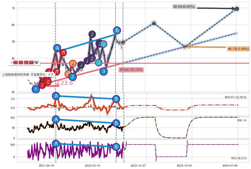 ♘ 在最后的上升阶段2020-12-29至2022-08-01存在 持续未破位的支撑位 ,支撑价格37.02,支撑可信任强度84.11%,其距离最后价格49.45相差 -25.13%