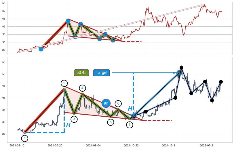 ➢ 最小中继整理涨幅→𝐇: 18.10 (𝐇楔型旗杆的长度:楔型起点→顶点)