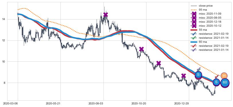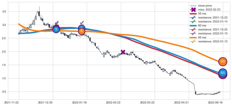 下跌趋势2021-11-22-2022-06-16,均线60, 95, 55确认关键阻力2处
