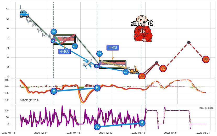 ➣ 【中枢B】:2021-10-15-2022-02-15,中枢由3笔构成,共82交易日, ZG=3.210, ZD=2.460