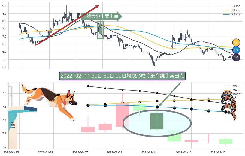 形态多维评估: ⚀ 2022-02-11日显现 30日-60日-90日均线 【绝命跳】卖出点 看空信号,后市看跌,卖出