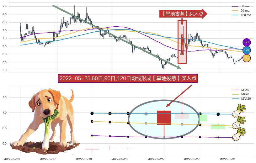 形态多维评估: ⚀ 2022-05-25日显现 60日-90日-120日均线 【旱地拔葱】买入点 看多信号,后市看涨,买入