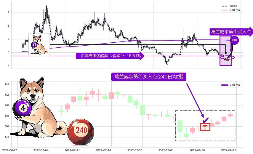 形态多维评估: ⚀ 2022-08-08-日显现 葛兰威尔均线 240日均线 第④买入点 下降趋势均值回复的短线反弹信号,后市看涨,买进信号