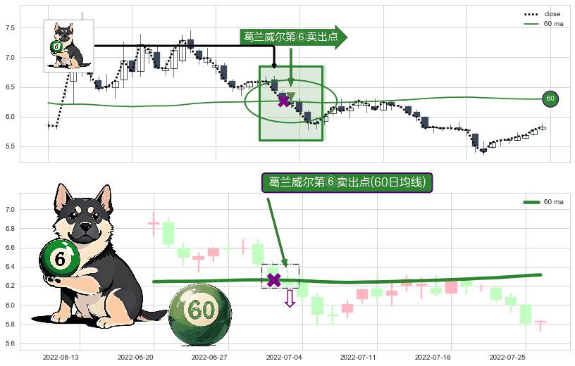 形态多维评估: ⚀ 2022-07-01-日显现 葛兰威尔均线 60日均线 第⑥卖出点 走势反转见顶信号,后市看跌,卖出信号