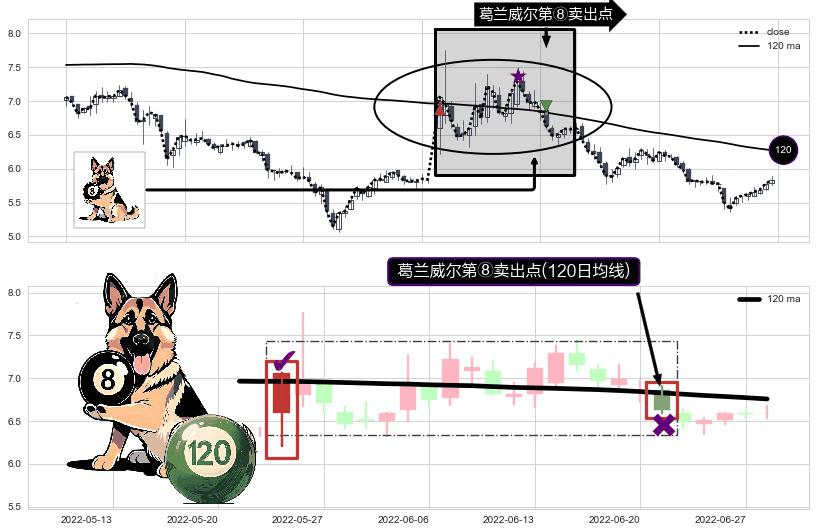 形态多维评估: ⚀ 2022-06-21-日显现 葛兰威尔均线 120日均线 第⑧卖出点 下降趋势的中继信号,后市看跌,卖出信号