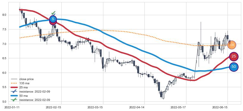 ⚂ 2022-05-25-日均线向上突破,2022-06-21-日重新下穿均线破位,均线阻力再次生效