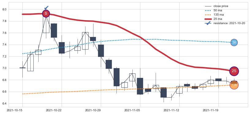 下跌趋势2021-10-15-2021-11-23,均线25确认关键阻力1处