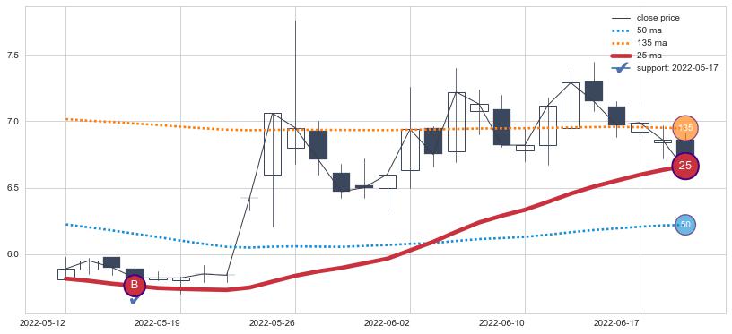 上涨趋势2022-05-12-2022-06-21,均线25确认关键支撑1处