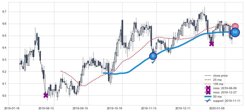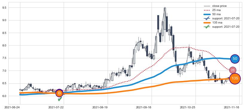 上涨趋势2021-11-11-2022-01-11,均线25, 135确认关键支撑2处