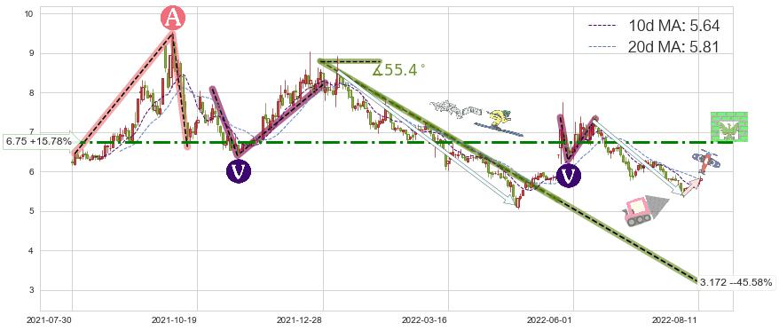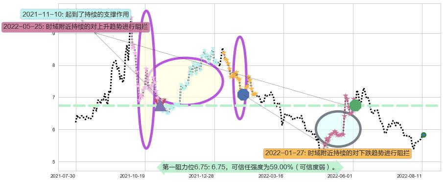♘ 阻力价格位6.75,可信任强度59.00%,距离最后交易2022-08-12形成的收盘价格5.83相差 +15.78%