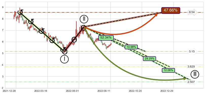 ➣ D点拟合预测价格9.02,距离最后交易收盘价格5.83相差 +54.78%