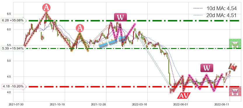 ♘ 阻力价格位5.39,可信任强度68.68%,距离最后交易2022-08-12形成的收盘价格4.65相差 +15.94%