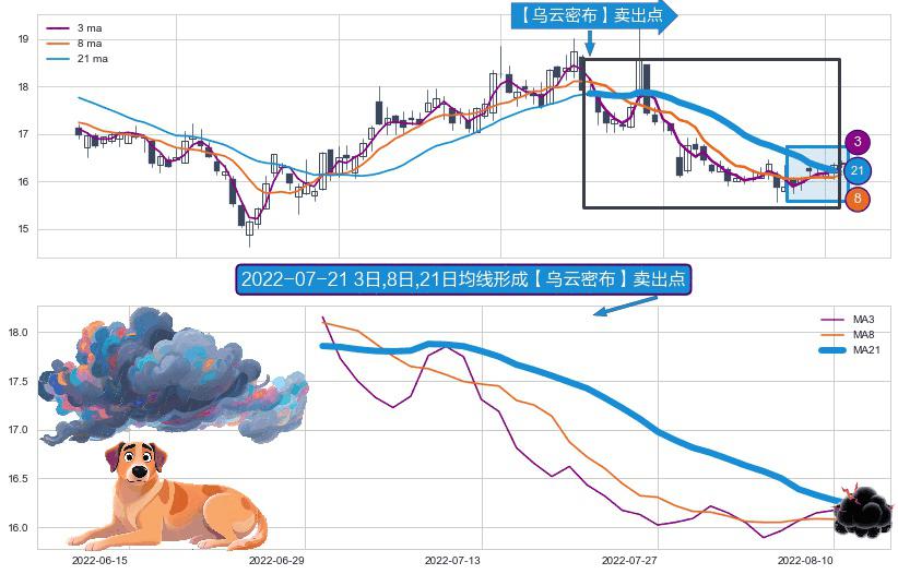⚀ 2022-06-30日-2022-08-11日显现 3日-8日-21日均线 【乌云密布】卖出点 看空信号,后市看跌,卖出