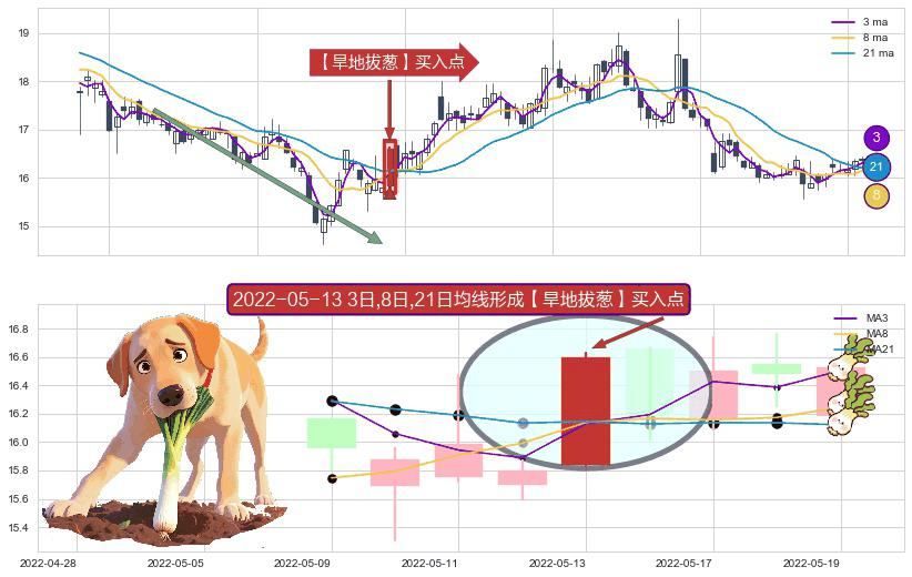 ⚀ 2022-05-13日显现 3日-8日-21日均线 【旱地拔葱】买入点 看多信号,后市看涨,买入