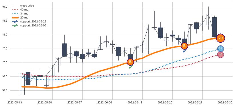 ⚀ 2022-05-11日-2022-06-29日显现 5日-10日-20日均线 【烘云托月】买入点 看多信号,后市看涨,买入