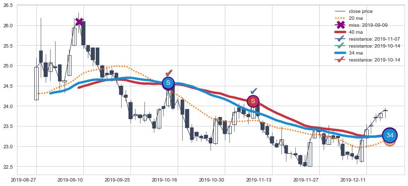 ⚅ 卖点向下突破均线后,价格走势有持续向下的迹象,但动能稍显不足,迟迟不能远离均线