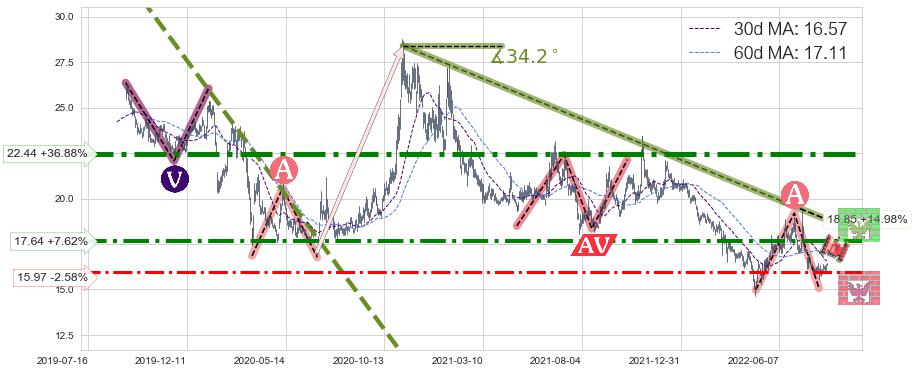 ♘ 阻力价格位22.44,可信任强度92.45%,距离最后交易2022-08-12形成的收盘价格16.39相差 +36.88%