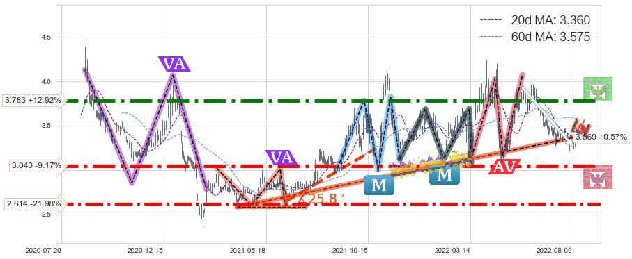 ♘ 阻力价格位3.783,可信任强度93.22%,距离最后交易2022-08-12形成的收盘价格3.350相差 +12.92%