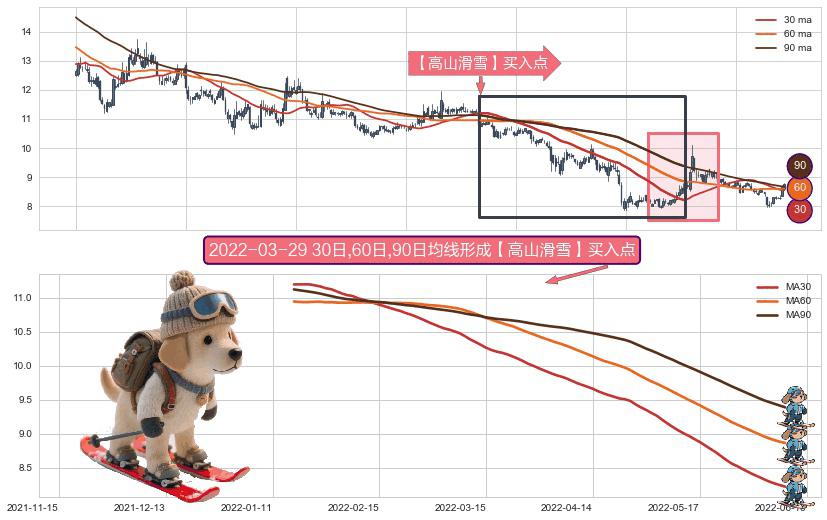 形态多维评估: ⚀ 2022-01-17日-2022-06-09日显现 30日-60日-90日均线 【高山滑雪】买入点 看多信号,后市看涨,买入
