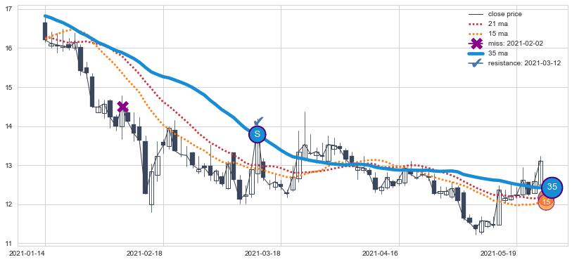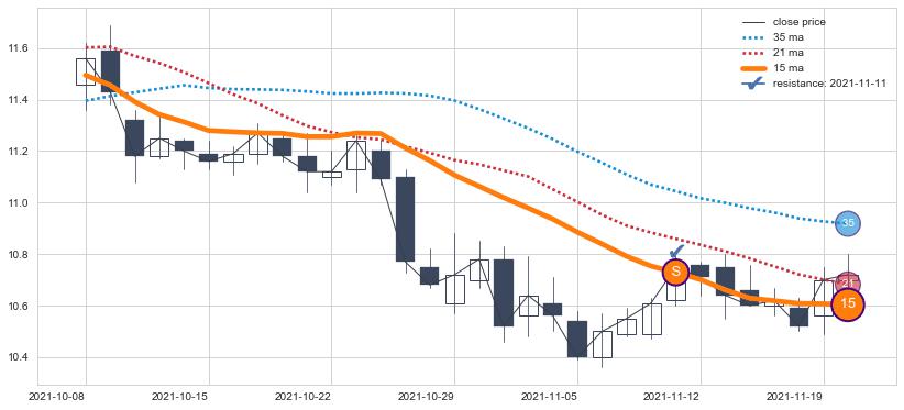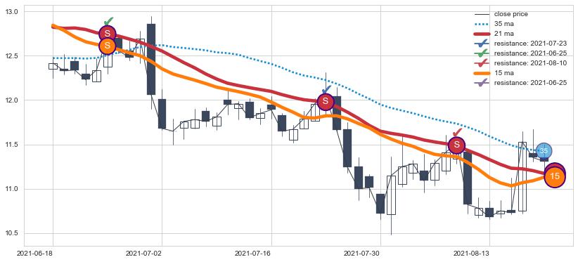下跌趋势2021-06-18-2021-08-20,均线21, 15确认关键阻力3处