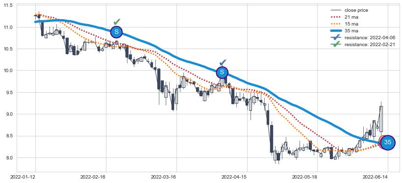 下跌趋势2022-01-12-2022-06-14,均线35确认关键阻力2处
