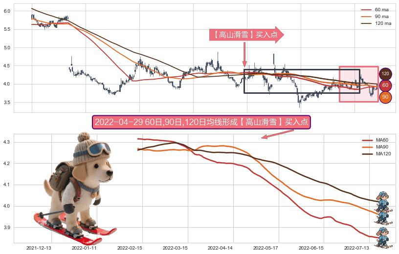 形态多维评估: ⚀ 2022-02-11日-2022-07-19日显现 60日-90日-120日均线 【高山滑雪】买入点 看多信号,后市看涨,买入