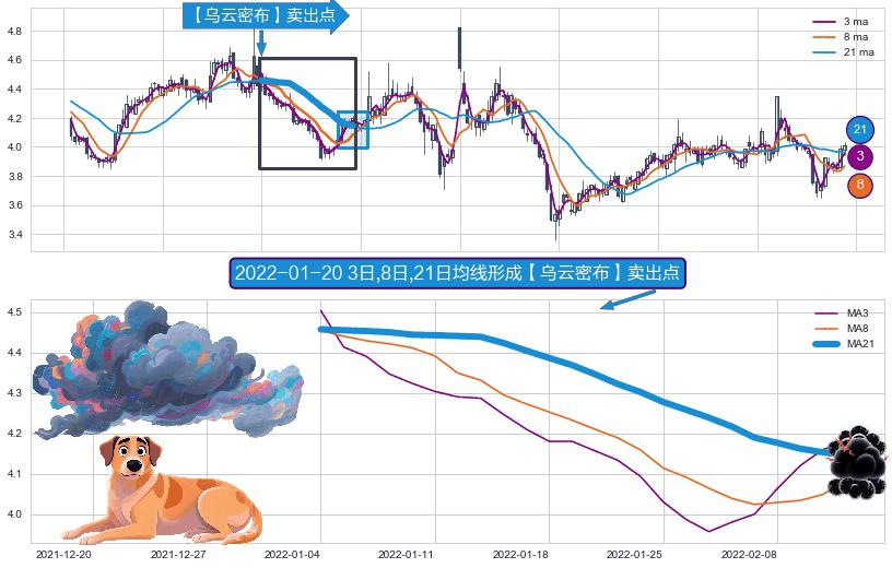 形态多维评估: ⚀ 2022-01-04日-2022-02-11日显现 3日-8日-21日均线 【乌云密布】卖出点 看空信号,后市看跌,卖出