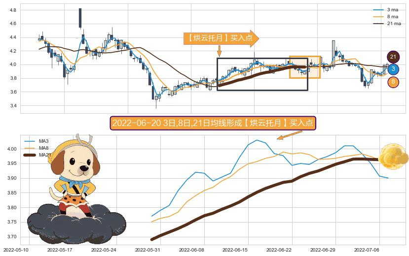 形态多维评估: ⚀ 2022-05-30日-2022-07-07日显现 3日-8日-21日均线 【烘云托月】买入点 看多信号,后市看涨,买入