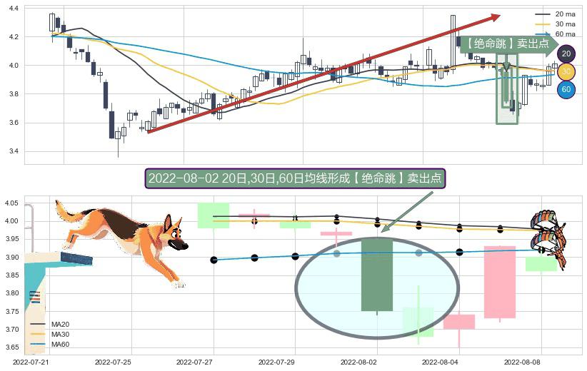 形态多维评估: ⚀ 2022-08-02日显现 20日-30日-60日均线 【绝命跳】卖出点 看空信号,后市看跌,卖出