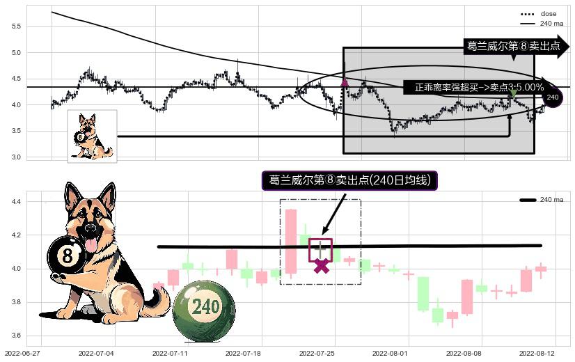 形态多维评估: ⚀ 2022-07-22-日显现 葛兰威尔均线 240日均线 第⑧卖出点 下降趋势的中继信号,后市看跌,卖出信号