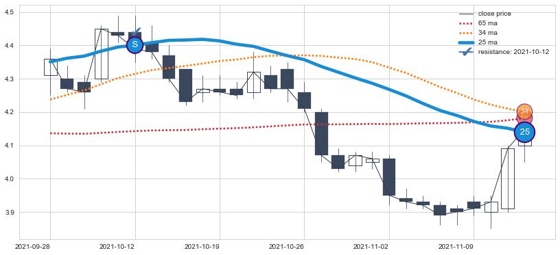 下跌趋势2021-09-28-2021-11-12,均线25确认关键阻力1处