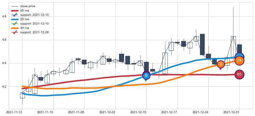 上涨趋势2021-11-12-2021-12-31,均线65, 34, 25确认关键支撑2处
