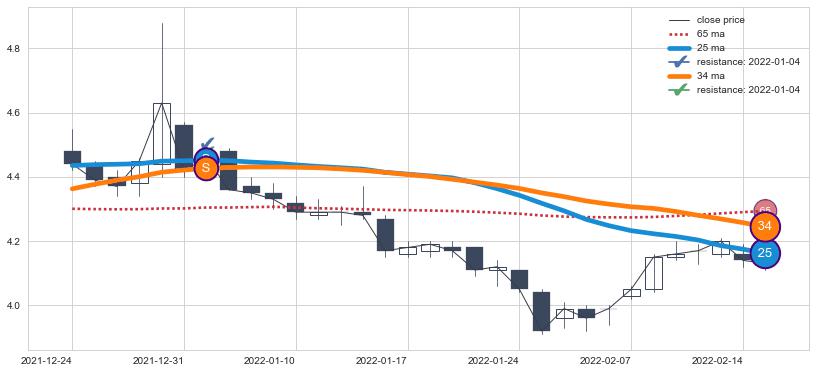 下跌趋势2021-12-24-2022-02-15,均线25, 34确认关键阻力1处