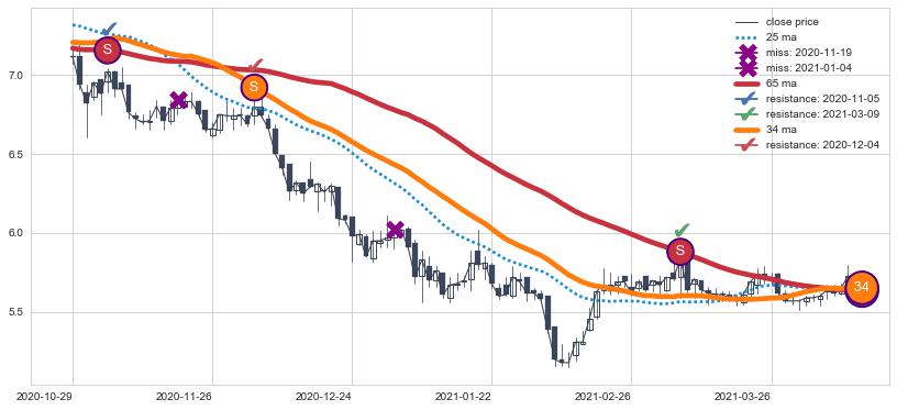 下跌趋势2020-10-29-2021-04-13,均线65, 34确认关键阻力3处