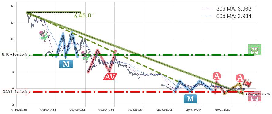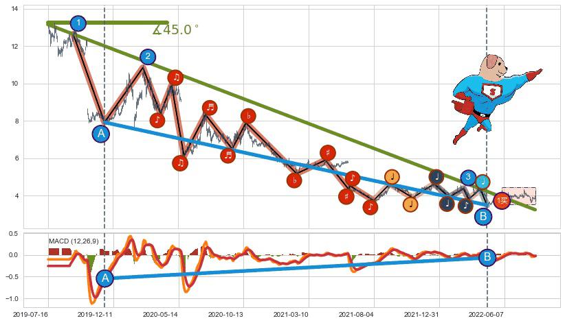 ➣ 2019-07-16-2022-06-14下跌趋势存在反转上涨[机会],虽然原下跌趋势的阻力位(3.247)已被突破,但其阻力效果尚存,原下跌趋势角度: 45.0˚