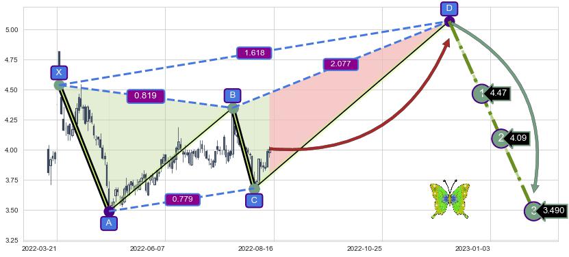 ➣ 未完成【蝴蝶】形态起点X: 2022-03-22, 已到达C点: 2022-08-03, 预测最终D点: 2022-12-07, 共181交易日