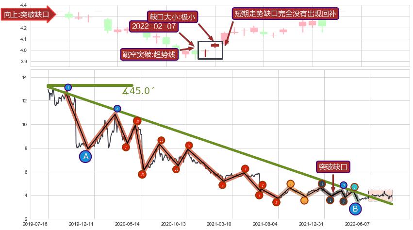 从2019-07-16至2022-06-14,共包含706个交易日,阶段股价下跌-87.59%,阶段股价变动位移路程比: 1 : 12,下跌趋势角度: 45.0,2019-10-17向↘︎形成缺口,跳空下跌-30.20%˚