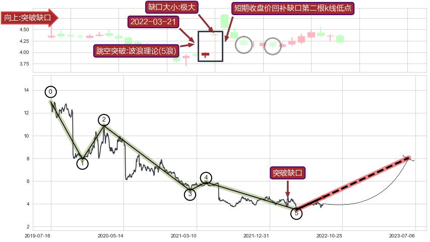 ➣ 突破缺口形成后,后续k已经超过14根,跳空突破波浪理论(5浪)关键点后, 出现【中度回踩】迹象,短期收盘价回补缺口第二根k线低点
