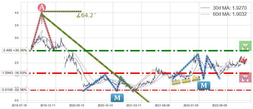 ♘ 阻力价格位2.489,可信任强度90.97%,距离最后交易2022-08-12形成的收盘价格1.9100相差 +30.30%