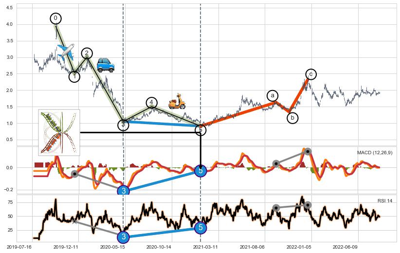 ➢ a,c调整浪MACD, RSI, KDJ走势都【未出现】背离,abc走势延续, 5浪反转概率增强