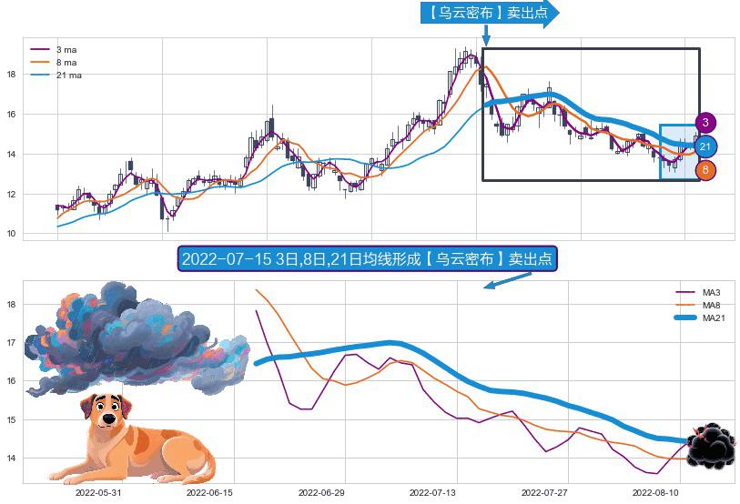 形态多维评估: ⚀ 2022-06-17日-2022-08-12日显现 3日-8日-21日均线 【乌云密布】卖出点 看空信号,后市看跌,卖出