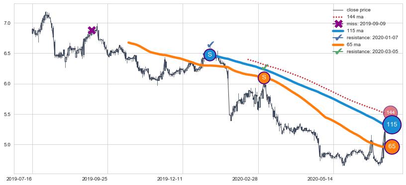 下跌趋势2019-07-16-2020-07-03,均线65, 115确认关键阻力2处