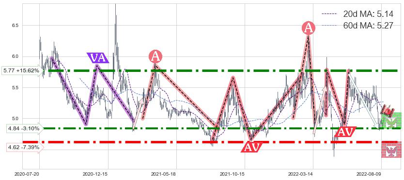 ♘ 阻力价格位4.84,可信任强度73.43%,距离最后交易2022-08-12形成的收盘价格4.99相差 -3.10%